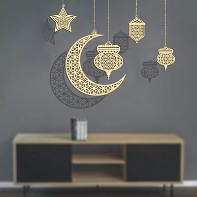 Enfudid 5 Pieces Ramadan Decorations Set, Wooden Pendant Ornament Decoration Islam Ramadan Star Wind Light Moon Lantern Shape Pendant Ornament for Ramadan Mubarak Eid Decorations